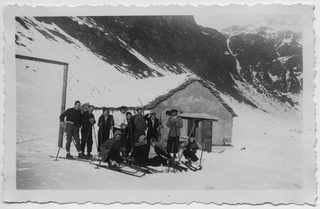 Gruppo di sciatori davanti a una stalla