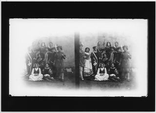 Gruppo di attori in costumi da scena in posa