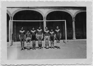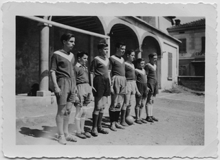 Squadra di calcio in posa sul piazzale dell'Oratorio di Tesserete