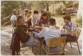 Partecipanti alla corsa di orientamento in occasione della Festa della Gioventù sul piazzale dell'oratorio di Tesserete