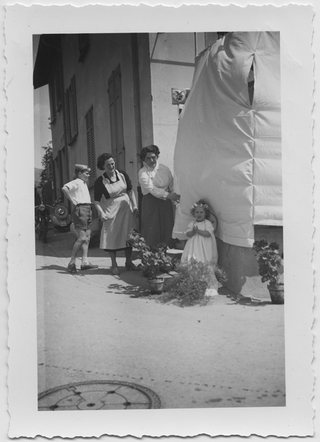 Famiglia Colombo davanti a una postazione allestita in occasione della processione del Corpus Domini