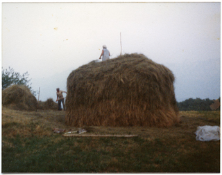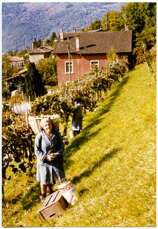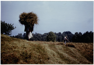 Piera Storni con un cargansc di fieno nel prato ai Monti di Condra