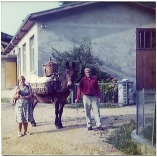 Plinio e Piera Storni accanto ad un cavallo da trasporto