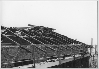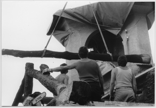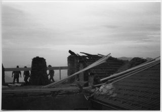 Operai al lavoro nella rimozione di travi dal tetto del Convento di Bigorio