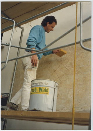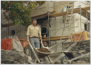 Operaio al lavoro durante il restauro del Cenobio del Convento di Bigorio