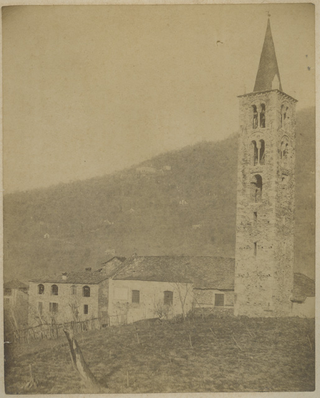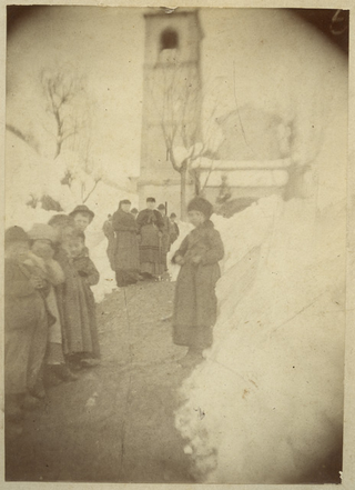 Abitanti di Bidogno davanti alla chiesa dopo una grande nevicata