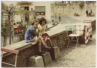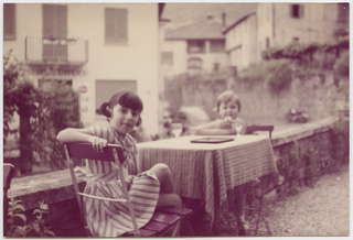 Bambine sedute ai tavolini esterni della pensione Eden