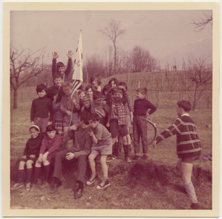 Camillo Bettosini con il gruppo degli Exclesior nell'orto della parrocchia a Comano