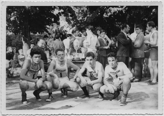 Squadra di calcio in posa sul piazzale dell'Oratorio di Tesserete