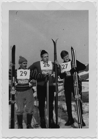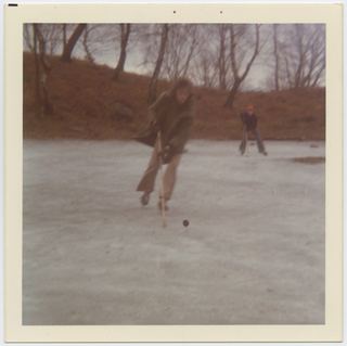 Mauro Mini e Gastone Besomi mentre giocano a hockey sul lago di Cess a Gola di Lago