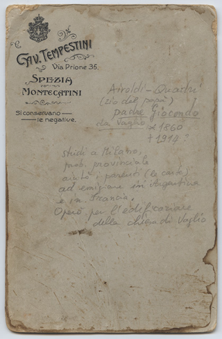 Retro del ritratto di Padre Giocondo Airoldi da Vaglio