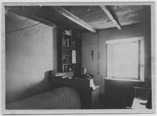 Padre Leone da Lavertezzo al lavoro nella sua cella al Santuario della Madonna del Sasso