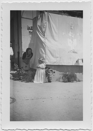 Famiglia Colombo davanti a una postazione allestita in occasione della processione del Corpus Domini