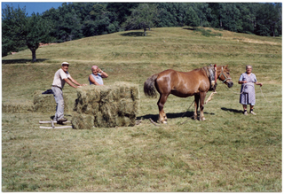 Piera Storni con un cargansc di fieno nel prato ai Monti di Condra