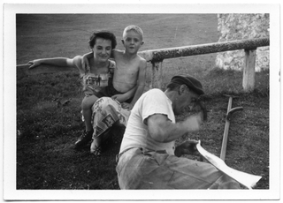 Plinio e Piera Storni accanto ad un cavallo da trasporto