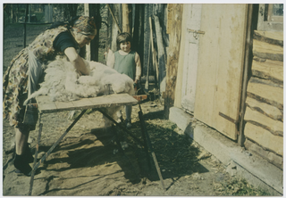 Sylva De Luigi mentre tosa una pecora a Campestro con Veronika Berner