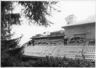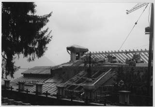 Operai sul tetto durante i lavori di restauro del Convento di Bigorio