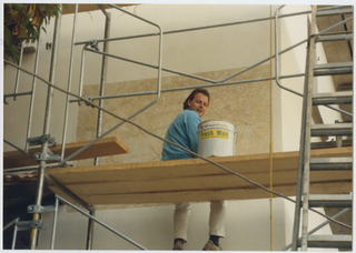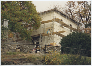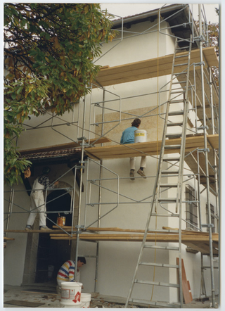 Operaio al lavoro durante il restauro del Cenobio del Convento di Bigorio
