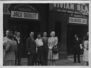 Elvezio Lucca con amici a Londra davanti ad un teatro
