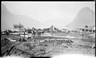 Uomini in posa durante i lavori di edificazione del lido di Lugano
