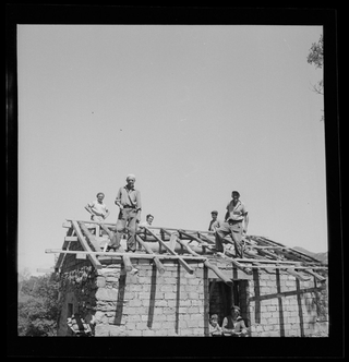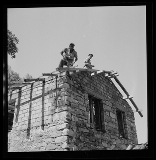 Uomini sul cantiere per la costruzione di un ponte a (?)
